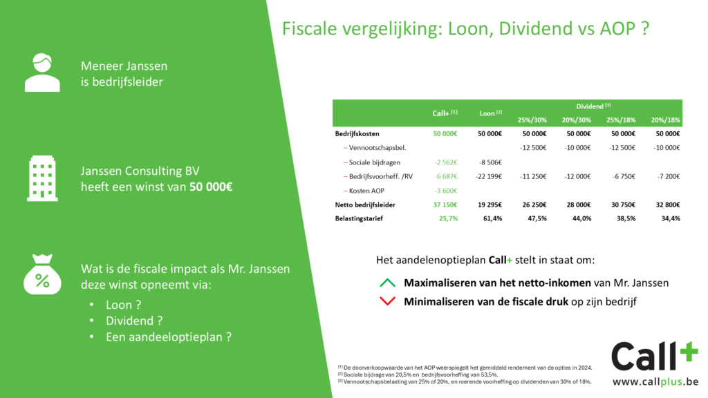 Maar wanneer de Bedrijfsleider de aandelenopties uitoefent (minstens na één jaar bezit), komt de waarde van deze verkoop hem toe zonder dat er belastingen of sociale bijdragen verschuldigd zijn.